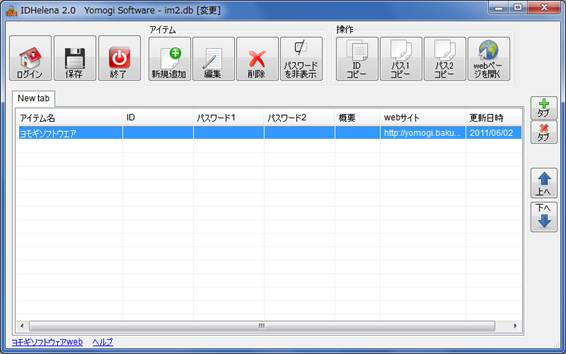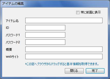 アイテム名、ID、パスワード1,2、概要、webサイト、の情報を記録することができます。